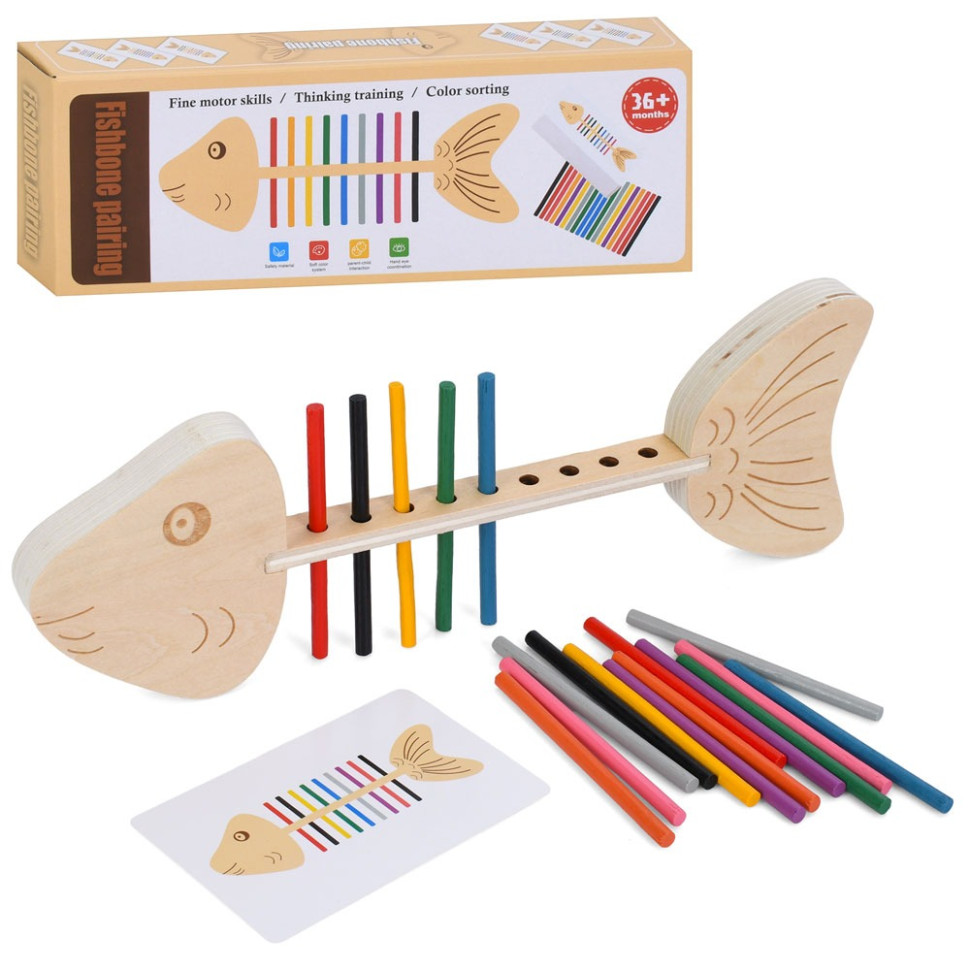 Дрібна моторика та точність: Завдання полягає у вкладанні (вбудовуванні) кольорових паличок у відповідні отвори “скелета” риби. Це чудово тренує координацію “рука-око” та спритність пальчиків.