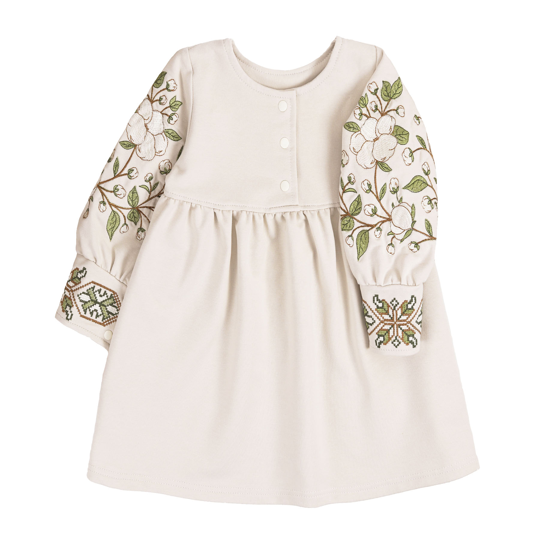 Ця сукня, мов тиха колискова з дитинства. Світла, ніжна, з витонченою вишивкою бавовни на рукавах, вона поєднує в собі чистоту, природну красу й українську душу. Кожна гілочка, кожна квітка – як символ турботи, любові та тепла, якими огортають дитину з перших днів.
