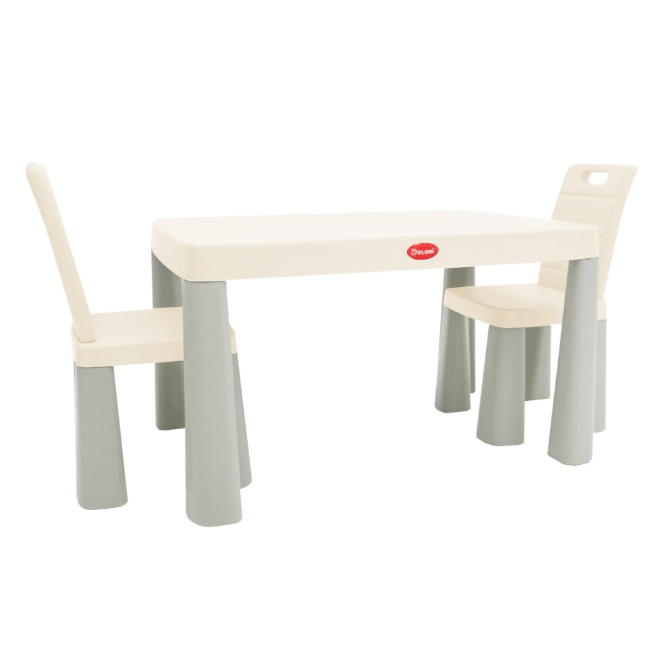 Новий дитячий стіл і два стільці Doloni 04680/04680/11 у спокійних сіро-бежевих відтінках — універсальний комплект дитячих меблів, який ідеально підходить як для ігор і занять удома, так і для використання на вулиці. Комплект складається з міцного пластикового столу та двох стільців, кожен із яких можна трансформувати в зручний табурет.