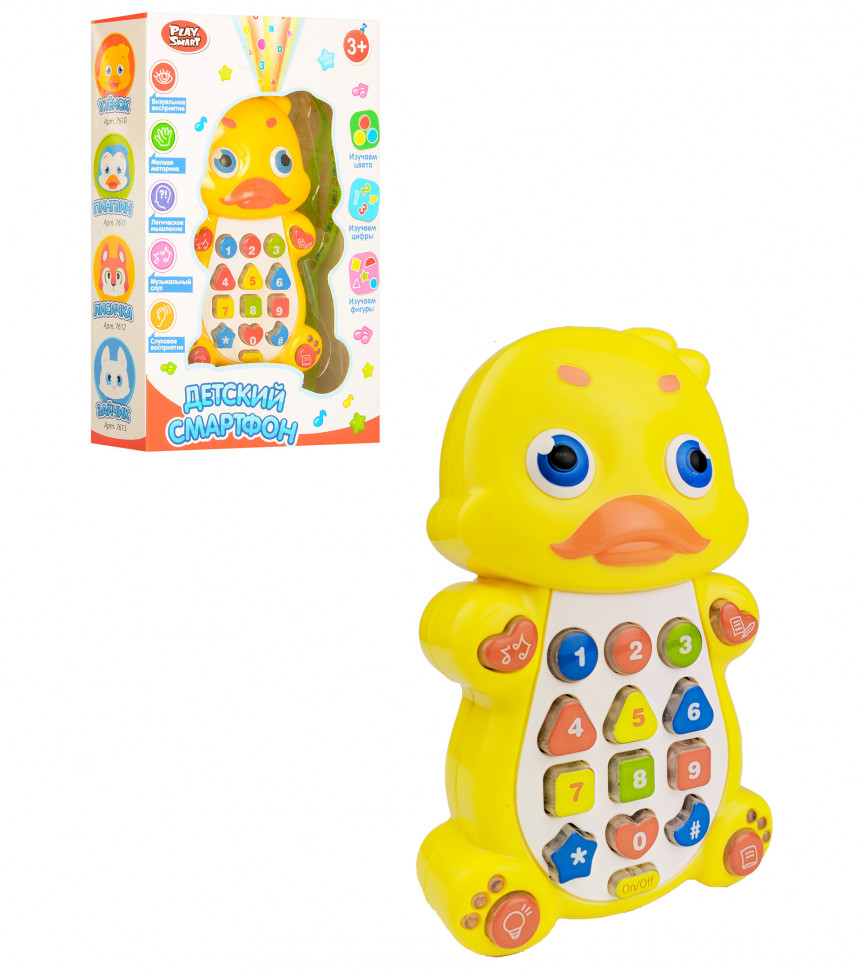 Телефон навчальний 7614, що володіє безліччю корисних функцій, відрізняється барвистим, привабливим дизайном. Кумедна розвиваюча іграшка представлена у вигляді милого звірятка, з яким Ваш малюк не побажає розлучатися ні на секунду. Міцний корпус, розроблений із зносостійкого, гіпоалергенного пластика, практично не має запаху і є абсолютно нешкідливим для дитячого здоров’я. Дитячий смартфон-звірятко розміром 14 см, з музичними ефектами українською мовою доповнений проектором. За допомогою іграшки Ваша дитина буде прослуховувати казки, вивчати цифри, віршики, нові кольори. Граючи і натискаючи на кнопки, дитина зможе самостійно активувати відтворення мелодій, розвиваючи дрібну моторику пальчиків і уяву. Завдяки вбудованому проектору Ваш малюк зможе направляти верхню частину телефону на чисту, білу поверхню, щоб подивитися зображення геометричних фігур і цифр.