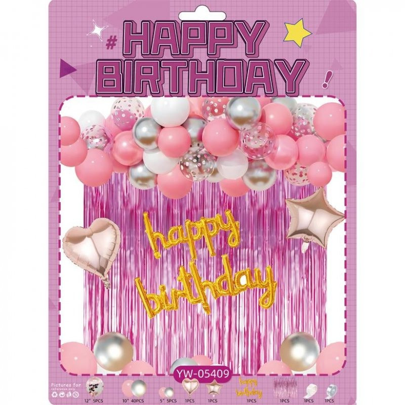 У комплект входять кулі з блискітками діаметром 12″ – 5 шт, кулі рожевого та сріблястого відтінків діаметром 10″ – 40 шт і 5″ – 5 шт, а також фольговані фігури: серце – 1 шт і зірка – 1 шт Додатково до набору входять декоративна шторка-“дощик”, напис Happy Birthday, стрічка для кріплення кульок і рулон клейових точок.