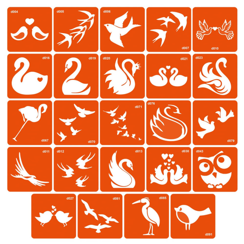 Колекція простих трафаретів птахів, 24 штуки в розмірі 6 на 6 см.