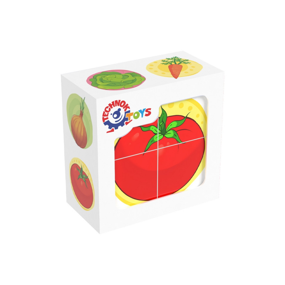 Набір складається з 4 кубиків, на кожній грані кубика фрагменти зображення овочів, які потрібно скласти в один малюнок. Розвиває логічне мислення, моторику пальців, фантазію.