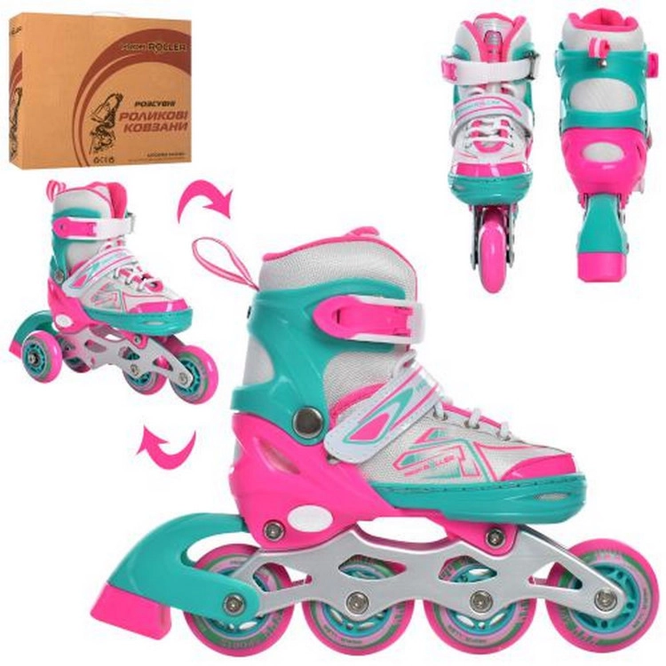 Розсувні дитячі роликові ковзани для початківців ролерів. Катання на роликових ковзанах допоможе розвинути у дитини координацію рухів і почуття рівноваги. Зручний високий напівм’який черевик добре сидить на нозі і не дасть нозі вискочити під час катання, а також захищає ногу від травм. Вентильований лайнер дозволяє нозі дихати. Корпус виготовлений з високоякісного полімеру і оснащений міцною алюмінієвою рамою і поліуретановими колесами. Система регулювання на 4 повних розміру дозволить вашій дитині кататися кілька сезонів, тим самим економити ваші гроші.
