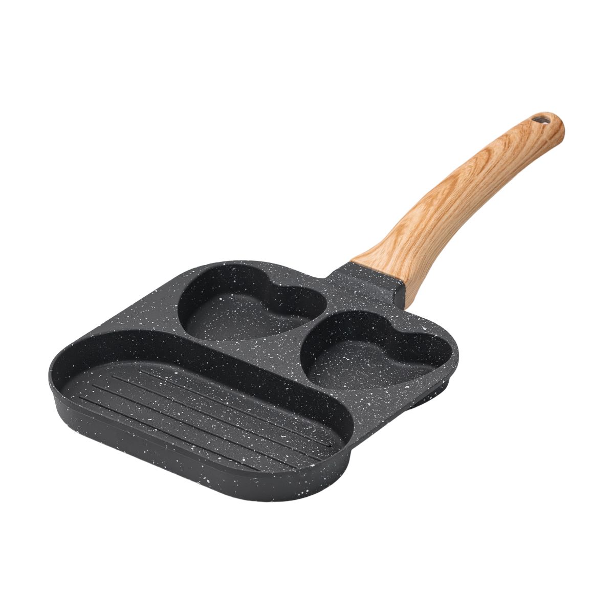 Сковорода квадратна порційна на 3 секції – це зручний інструмент для приготування різноманітних страв, забезпечуючи можливість готувати одразу кілька компонентів на одній пательні. Виготовлена з алюмінію з антипригарним покриттям, сковорода розділена на три секції, одна з яких має рифлене дно, що дозволяє створювати страви з характерними смужками гриля. Зручна ручка, що не нагрівається, захищає ваші руки від опіків, додаючи комфорту під час використання. Антипригарне покриття ефективно запобігає пригоранню їжі, дозволяючи готувати без використання олії. Унікальна конструкція дна сприяє відмінній теплопровідності та рівномірному розподілу температури по всій поверхні сковороди. Товсте дно забезпечує ідеальне розсіювання тепла, що сприяє рівномірному приготуванню страв з насиченим ароматом. Ця квадратна сковорода стане вашим надійним помічником у приготуванні смачних страв. Запобіжні заходи під час використання сковороди: Рекомендується готувати на малому або середньому вогні. Використовуйте силіконові або дерев’яні столові прилади, щоб захистити поверхню від подряпин. Категорично не рекомендується використовувати металеві ложки та кухонні лопатки. Щоб запобігти пошкодженню, слід мити сковороду тільки після повного охолодження, не використовувати жорсткі мочалки, щітки, абразивні пасти та порошки для чищення, агресивні речовини. Основні характеристики сковороди: розмір сковороди 18×18×2 см; висота стінок сковороди 2 см; об’єм більшої секції 200 мл; об’єм менших секцій по 100 мл; товщина стінок 2 мм; матеріал ручки – бакеліт; антипригарне покриття. Переваги сковороди: сковорода підходить для газових та електричних плит; безпечне антипригарне покриття без шкідливих сполук; гранітне покриття для запобігання прилипання їжі та рівномірного розподілу тепла; ергономічна ручка, що не нагрівається в процесі приготування; квадратна форма для економії місця на варильній поверхні.